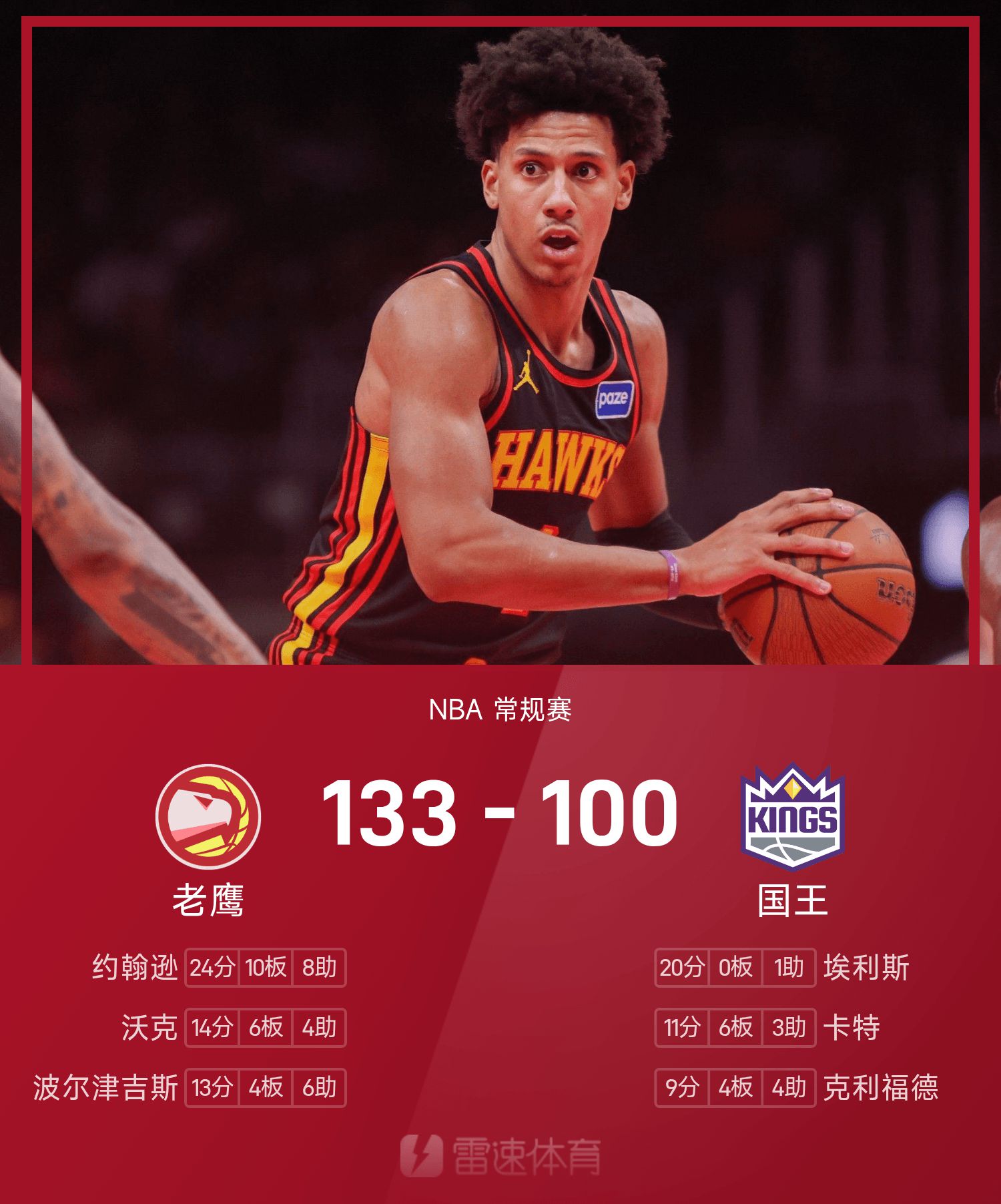 Báo cáo trận đấu NBA: Johnson có 24 điểm, 10 rebound và 8 kiến tạo, Hawks đánh bại Kings 133-100