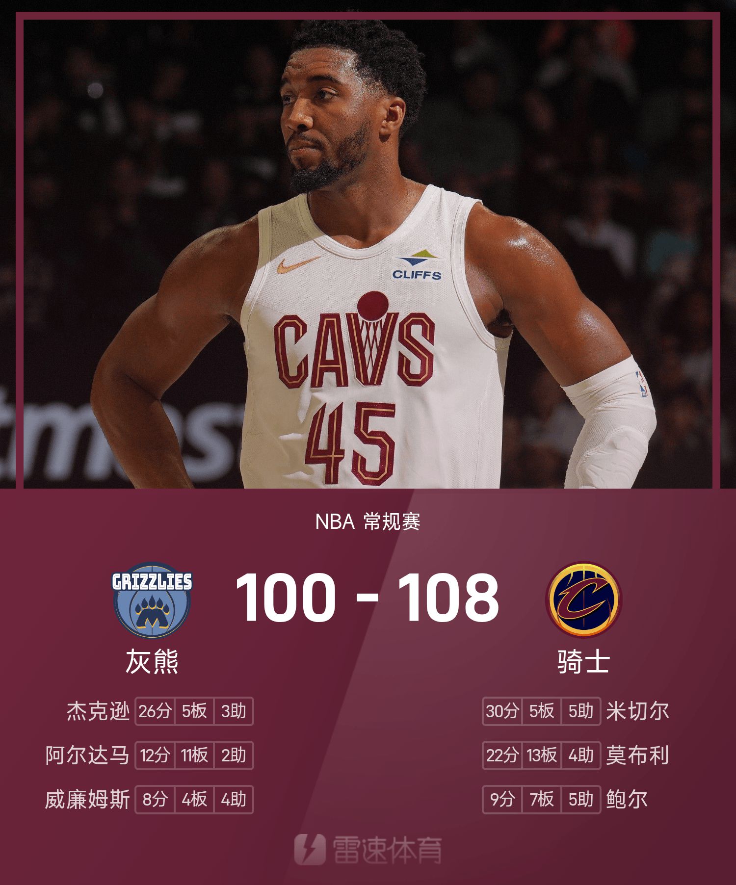 Báo cáo trận đấu NBA: Mitchell 30+5+5, Cavaliers đảo ngược Grizzlies 108-100