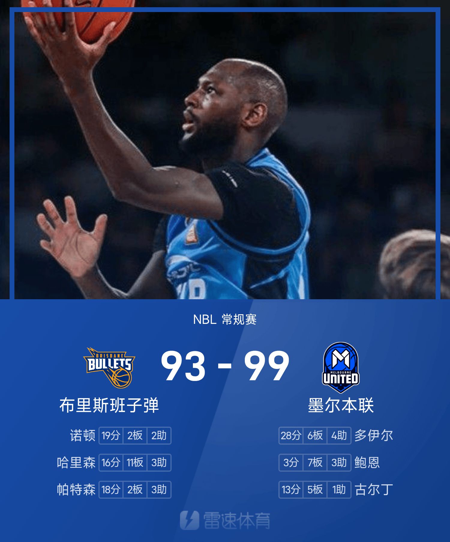 Cuối trận, Melbourne United đã đánh bại Brisbane Bullets với tỷ số 99-93.