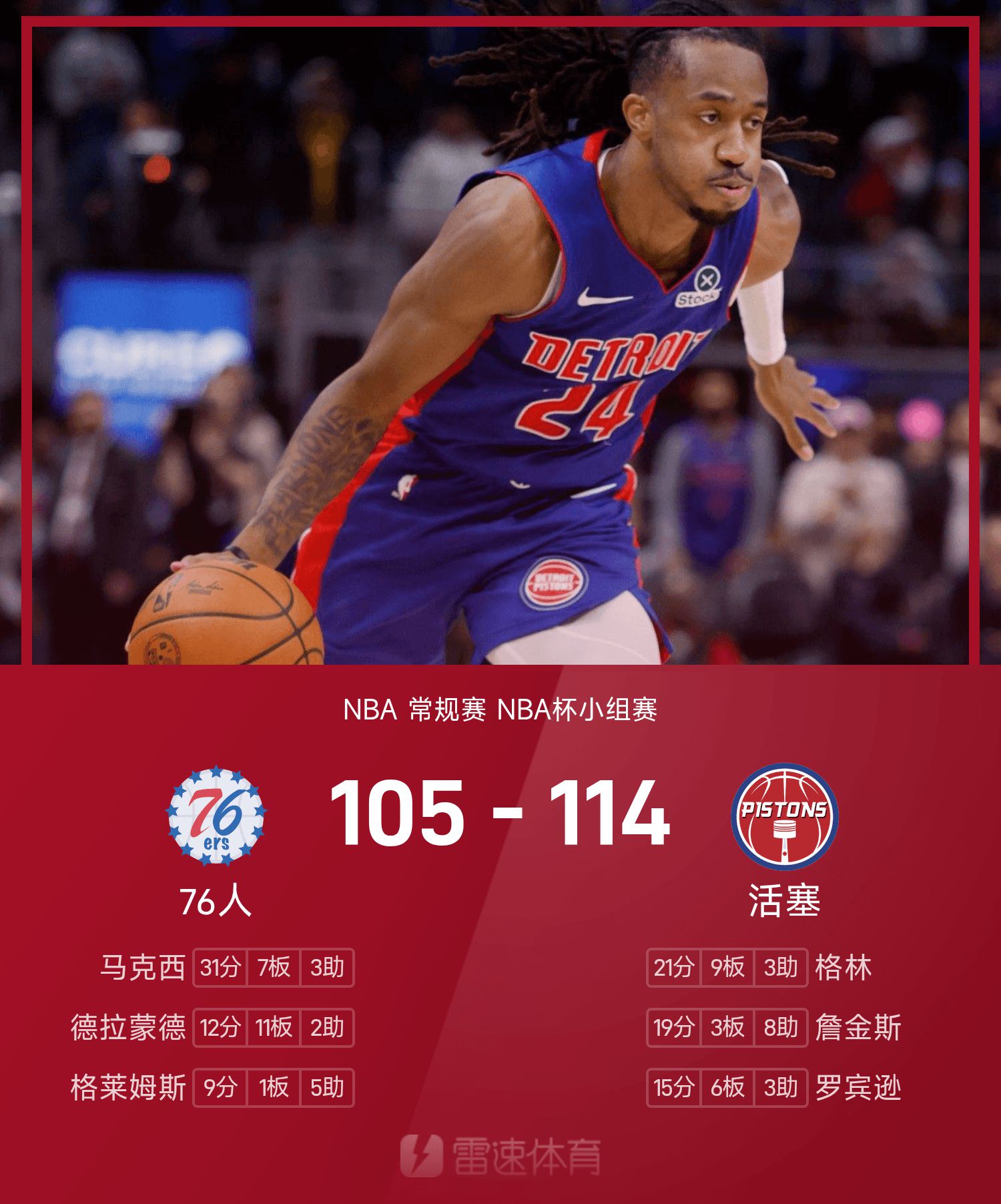 6686 Thể thao Tin tức ngày 15 tháng 11 Trong trận đấu vòng bảng NBA Cup mùa giải thường lệ 25/26, đội Pistons đối mặt với 76ers. Kết thúc trận đấu, Pistons đánh bại 76ers với tỷ số 114-105. Green ghi 21 điểm, 9 rebound và 3 kiến tạo để dẫn dắt đội đến chiến thắng. Maxi ghi được 31 điểm cao nhất trận, 7 rebound và 3 kiến tạo.