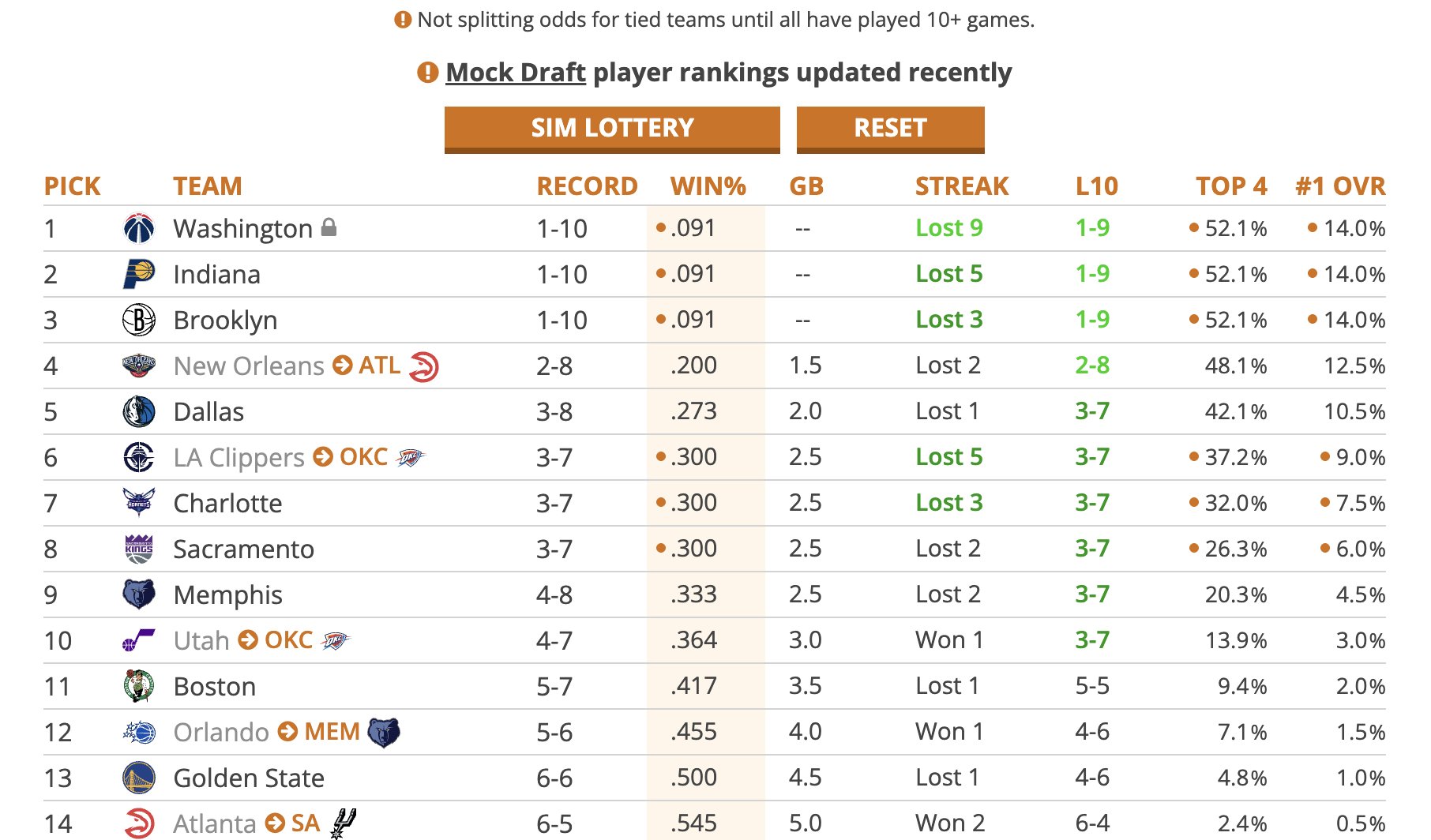 6686 Bản tin thể thao ngày 12/11 Phương tiện truyền thông Tankathon của Mỹ đã cập nhật xác suất xổ số dự thảo 2026 hôm nay dựa trên thành tích hiện tại của mỗi đội trong giải đấu. Vì Wizards, Pacers và Nets đều có thành tích 1 thắng và 10 thua nên xác suất nhận được lượt chọn số 1 là 14% và xác suất nhận được 4 lượt chọn hàng đầu là 52,1%.