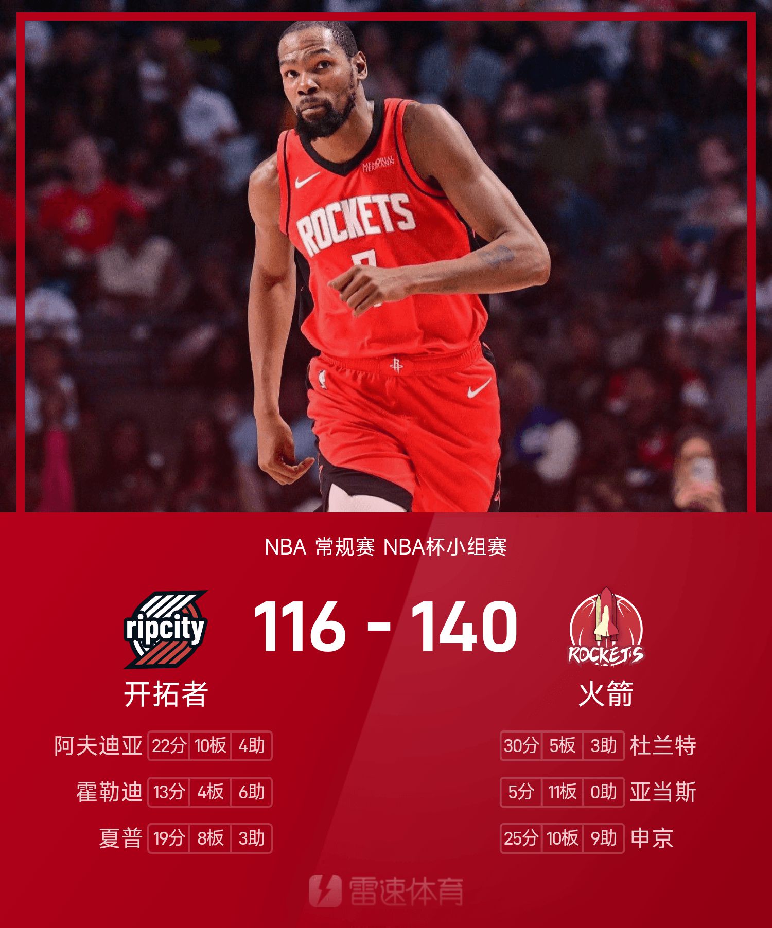 Báo cáo NBA Cup: Durant ghi 30 điểm, Rockets đánh bại Trail Blazers 140-116