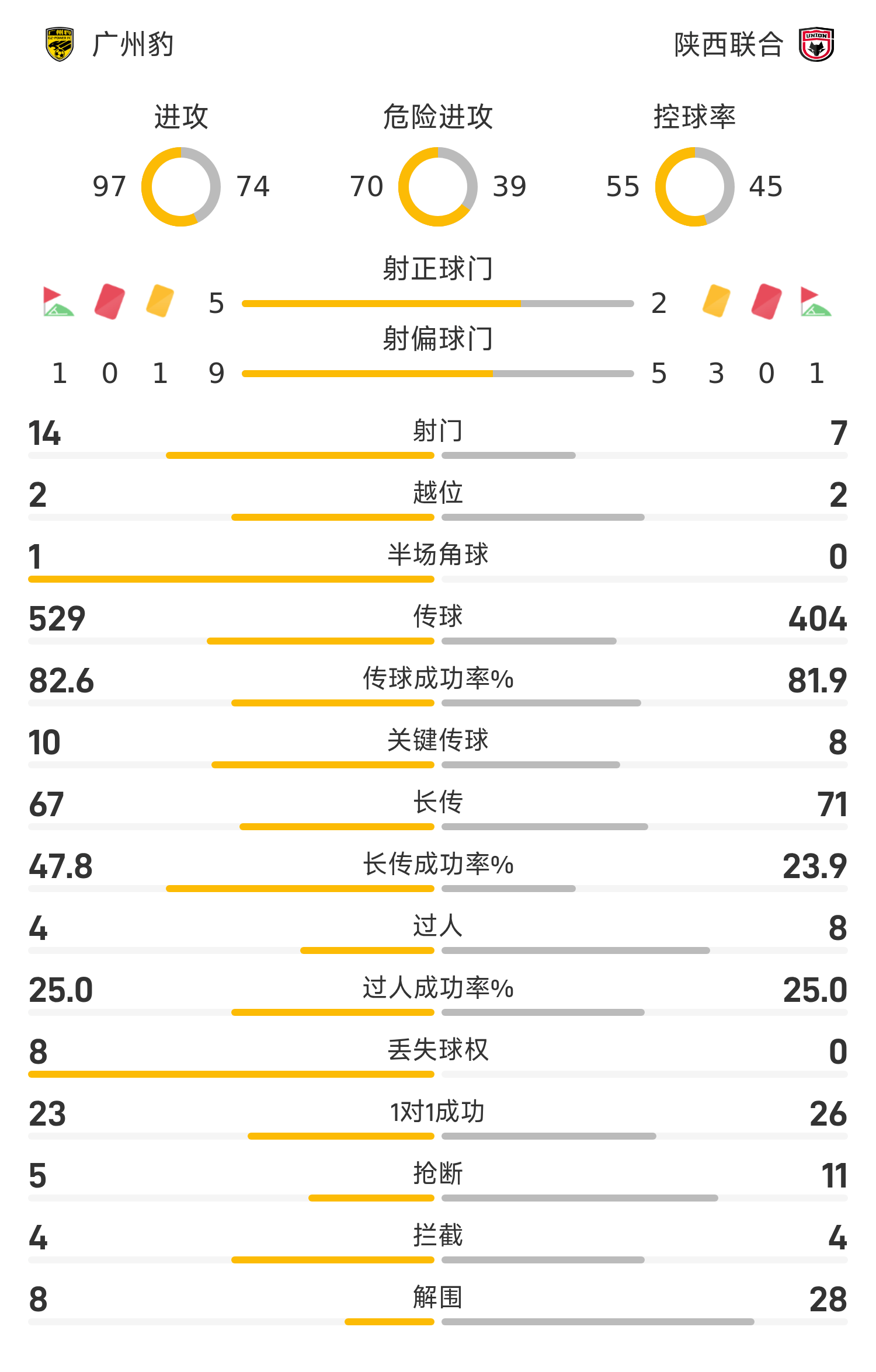 Đội hình xuất phát của Quảng Châu Leopards: 22-Xiao Jiaqi, 5-Jiang Jihong, 3-Han Xuân, 15-Deng Biao (81'42-Yang Hao), 37-Shang Yin (73'14-Zeng Chao), 25-Wang Jianming, 8-Cai Haochang (46'7-Carlos), 6-Duan Yunzi (90'1) 7-Yan Zihao), 11-Nikon, 20-Rosa, 9-Xia Dalong (73'10-Liang Xueming)