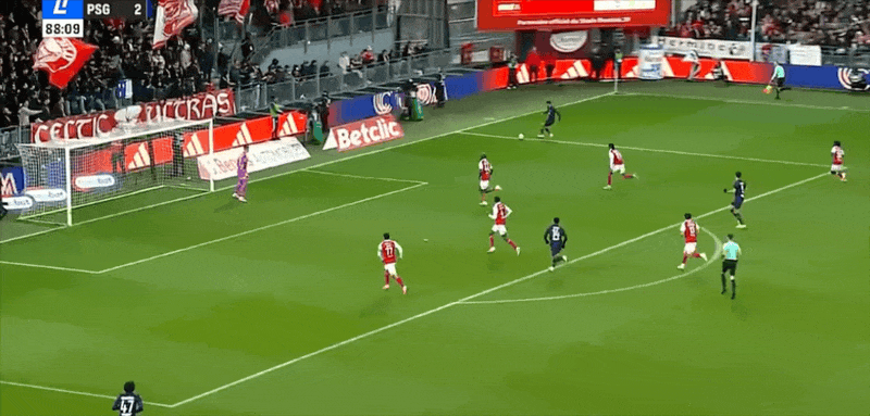 87' Brest phản công ở phần sân phía trước, Balde mất thăng bằng và sút trúng khung thành chỉ sau một cơ hội duy nhất.