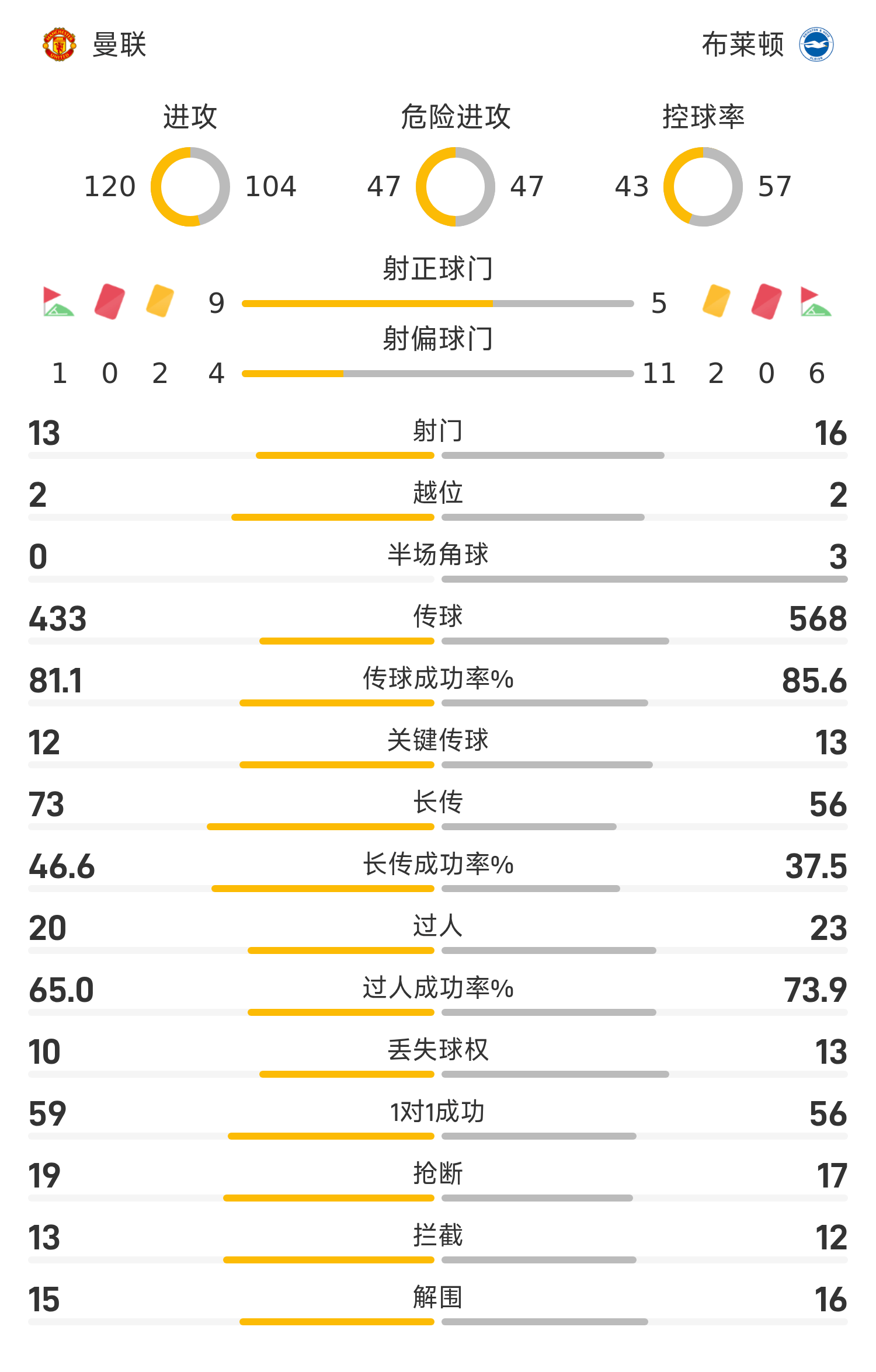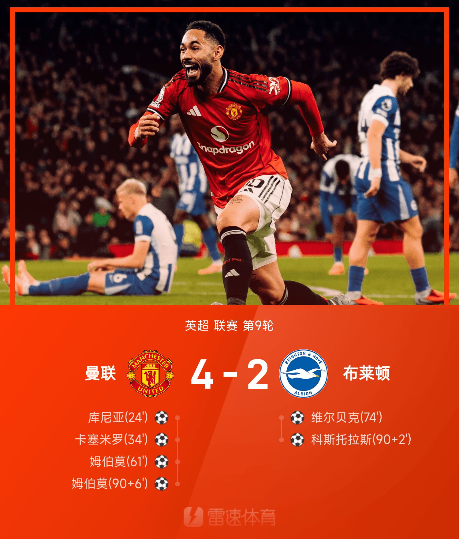 Phút 61 của hiệp hai, Sheshko kiến tạo cho Mbemo ghi bàn một cách bình tĩnh. Manchester United nâng tỉ số lên 3-0. Phút 74, Welbeck tận dụng cơ hội đá phạt trực tiếp để ghi bàn, Brighton có bàn gỡ hòa. Phút bù giờ thứ 2, Milner thực hiện quả đá biên và kiến tạo cho Kostoras đánh đầu ghi bàn. Trong thời gian đếm ngược của trận đấu, Mbemo bình tĩnh đẩy góc xa và ghi bàn ấn định chiến thắng. Manchester United cuối cùng đã đánh bại Brighton 4-2 trên sân nhà, mở ra chiến thắng thứ ba liên tiếp của họ.