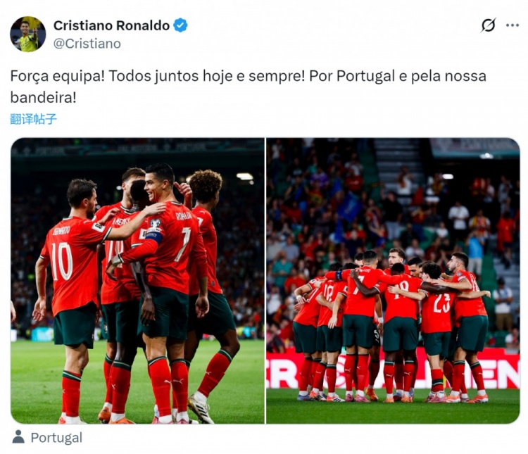 Vắng mặt trong trò chơi này do bị đình chỉ! Cristiano Ronaldo đăng thông điệp lên mạng xã hội cổ vũ đồng đội: đoàn kết và chiến đấu vì Bồ Đào Nha