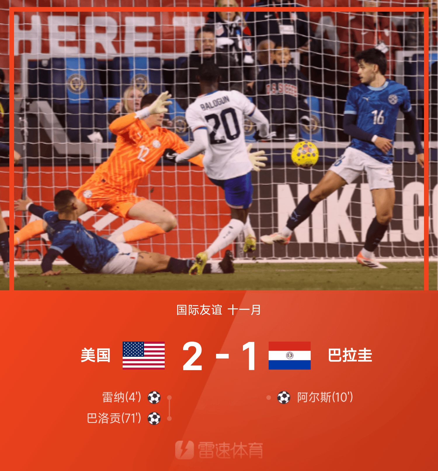 6686 Sports đưa tin ngày 16/11 rằng trận giao hữu quốc tế mở ra cuộc đọ sức, đội chủ nhà Mỹ đối đầu với Paraguay. Đối với đội Hoa Kỳ, Balogun và Reina lần lượt ghi bàn, trong khi đối với Paraguay, Als ghi bàn và không cứu được trận đấu. Chung cuộc, Mỹ đánh bại Paraguay với tỷ số 2-1.