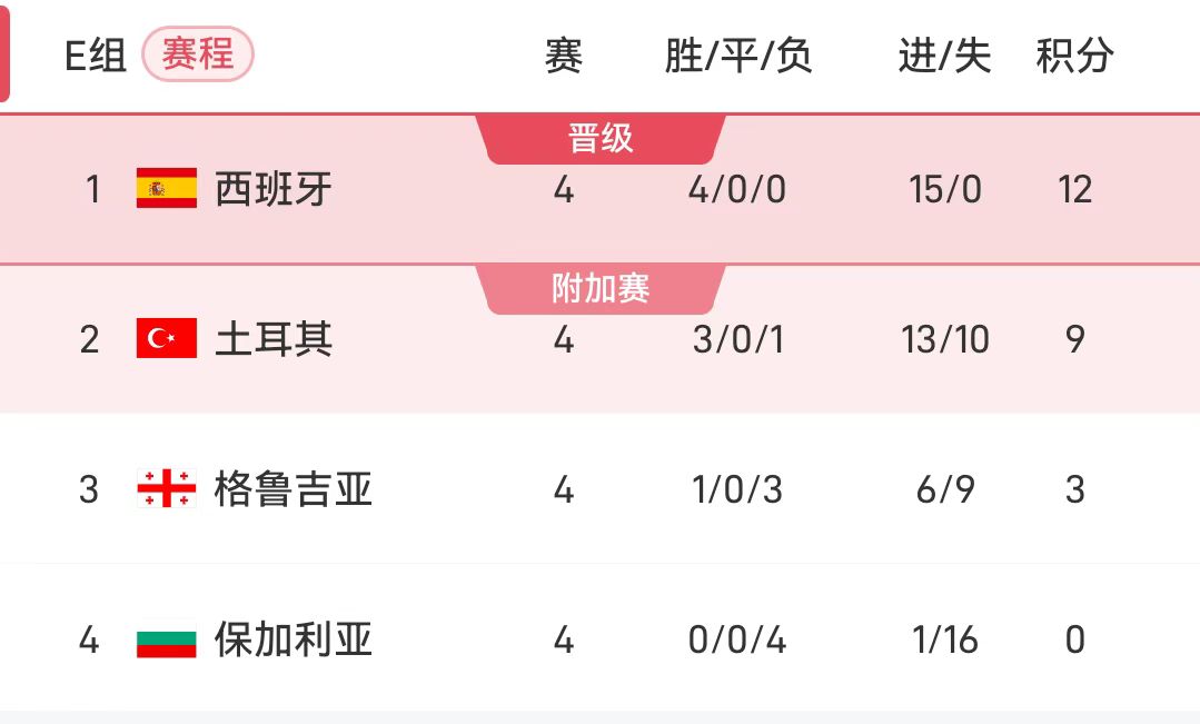 Trong trận đấu tiếp theo ở bảng E, Tây Ban Nha sẽ gặp Georgia và Thổ Nhĩ Kỳ sẽ gặp Georgia. Tây Ban Nha hiện đang dẫn trước 3 điểm sẽ tiến tới Mỹ, Canada và Mexico trước thời hạn 1 vòng đấu nếu thắng vòng này và Thổ Nhĩ Kỳ không giành trọn 3 điểm.